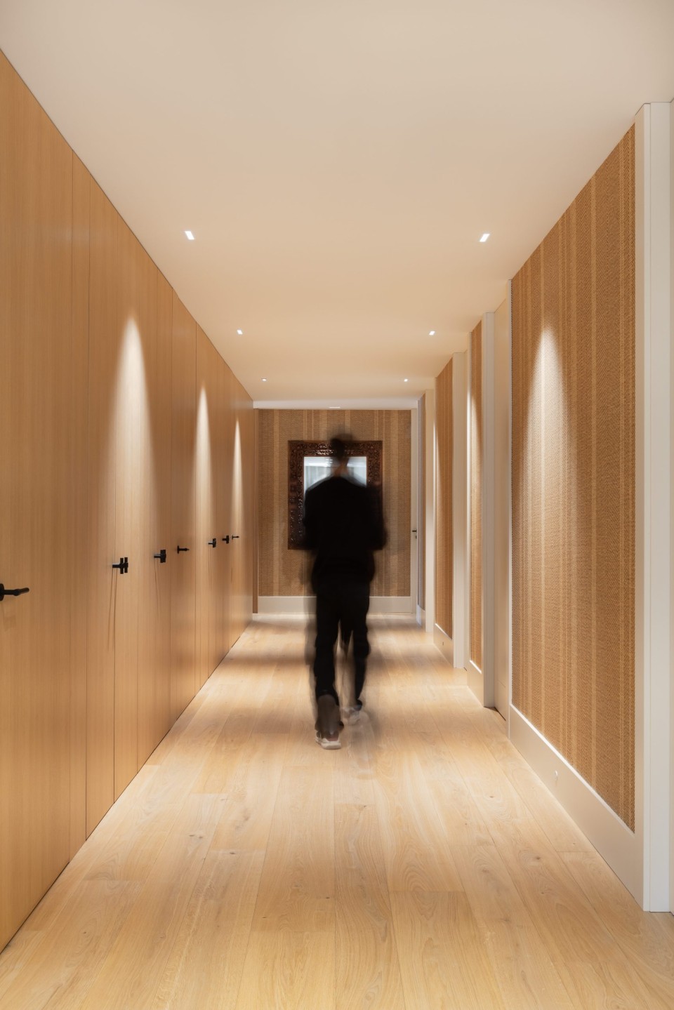El dormitorio principal retoma esta sensibilidad, con un cabecero tapizado a medida que se extiende hasta las mesillas integradas y una iluminación perimetral indirecta que acompaña sin invadir. Los baños exploran distintas materialidades, desde cerámica artesanal esmaltada hasta revestimientos tipo terrazo en trevertino, para lograr atmósferas limpias, sofisticadas y sensoriales, donde la funcionalidad nunca compromete la belleza.