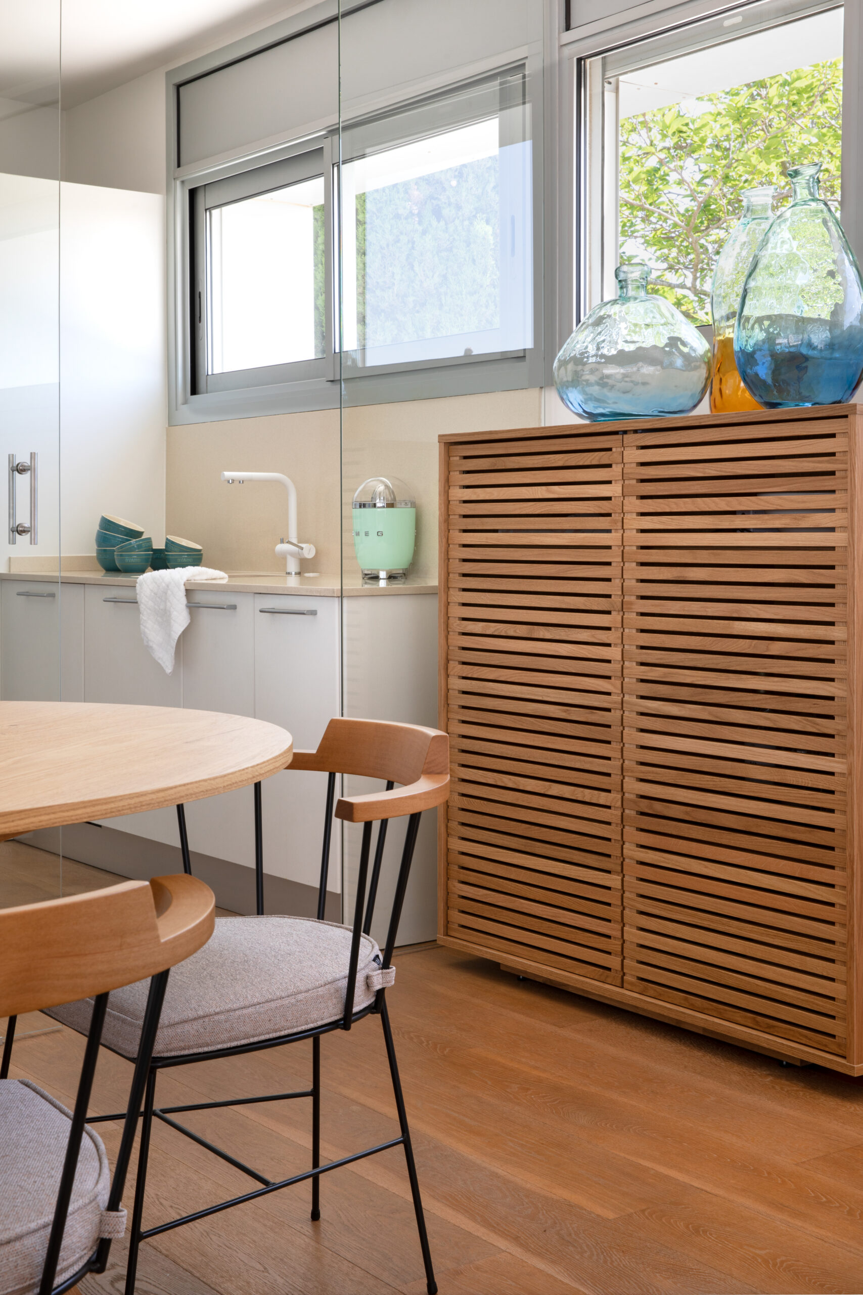 La distribución de los espacios se ha repensado para ganar amplitud y mejorar la conexión entre interior y exterior. La zona de día, salón, comedor y cocina, fluye con naturalidad hacia la terraza, concebida como una prolongación vivida del hogar, con mobiliario ligero, vegetación integrada y detalles que invitan a la desconexión.