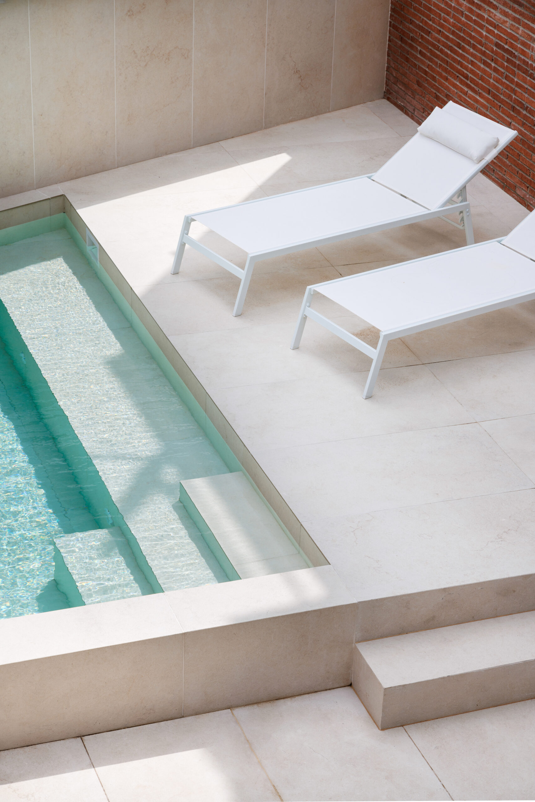 El dormitorio principal se concibe como un refugio íntimo, con una paleta suave, mobiliario a medida y un diseño de armarios que enfatiza la linealidad y la calma visual. Los baños, revestidos en cerámica esmaltada, madera y piedra, exploran el contraste entre lo matérico y lo pulido, apostando por una elegancia sutil y atemporal. La escalera, envuelta en un juego de líneas verticales negras y superficies translúcidas, se transforma en una pieza escultórica que articula la entrada de la casa.