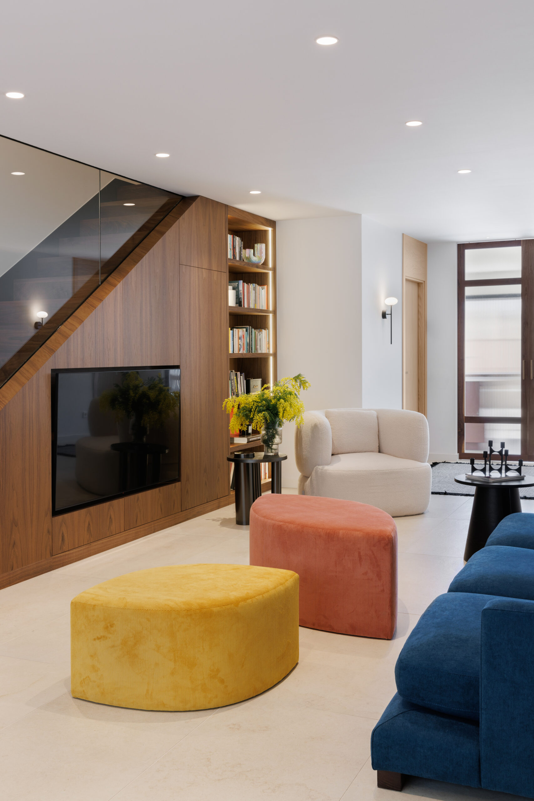 El salón principal, presidido por un sofá azul profundo y pufs (diseñados por el estudio para este proyecto en concreto), y a modo de mesa, en pana de tonos mostaza y rosa, invita a la pausa con una composición que equilibra volumen, color y confort. El mueble de entretenimiento esta integrado en el bajo la escalera, ejecutado en madera de nogal y con iluminación integrada tenue, refuerza la idea de hogar vivido y pensado hasta el último rincón.